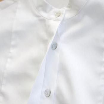 フロントは比翼仕立て。ボタンは貝ボタンがつきます。貝は天然素材につき若干の色の違いも魅力です。